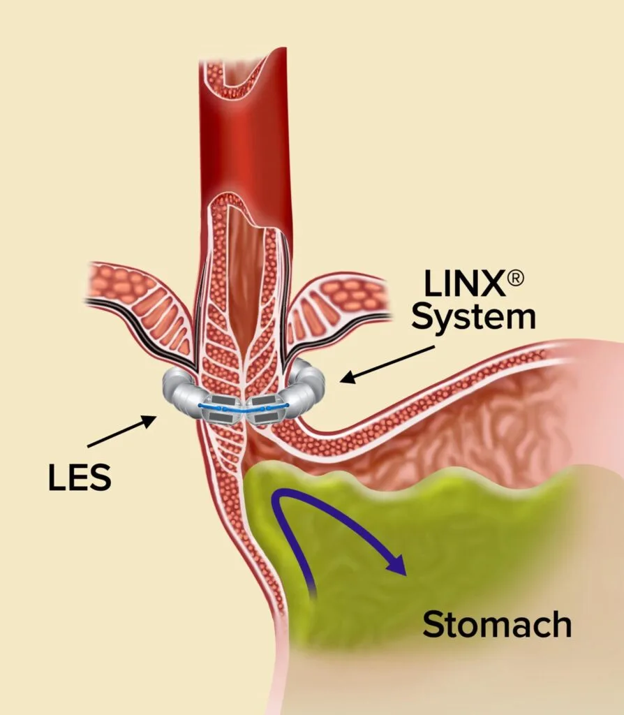 LINX is a small implant comprised of interlinked titanium beads with magnetic cores. The magnetic attraction between the beads augments the existing esophageal sphincter’s barrier function to prevent reflux. The device is implanted using a standard minimally invasive laparoscopic procedure and for many patients it is an alternative to the more anatomically disruptive fundoplication, commonly used in surgical anti-reflux procedures. The LINX Reflux Management System is indicated for those patients diagnosed with GERD as defined by abnormal pH testing, and who continue to have chronic GERD symptoms despite maximum medical therapy for the treatment of reflux.